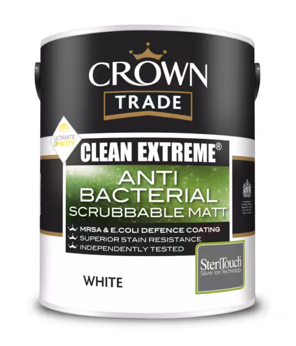Crown Trade Clean Extreme Anti Bacterial Scrubbable Matt е професионална мат боја на водена база со вградено антибактериско дејство, дизајнирана за внатрешни ѕидови и тавани во простории каде хигиената и долготрајната заштита се приоритет. Благодарение на напредната формула со SteriTouch® технологија, оваа боја активно го намалува присуството на штетни бактерии како MRSA и E.coli на површината, правејќи ја идеална за чувствителни средини како здравствени установи, училишта, кујни, детски градинки, домови за нега и други јавни објекти. Сертифицирана класа 1, овозможува до 10.000 бришења, што ја прави извонреден избор за простории со високи хигиенски стандарди и интензивна употреба.